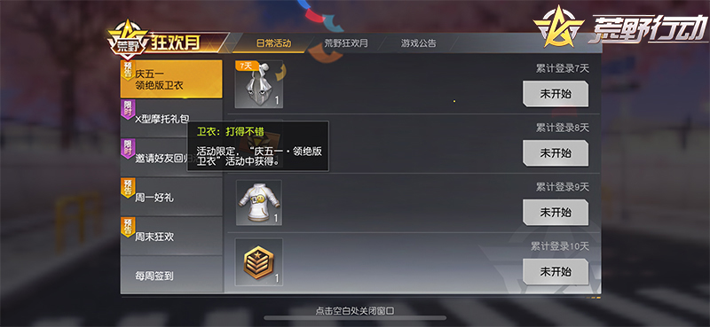荒野行动五一狂欢月累计登录9日 领取绝版卫衣