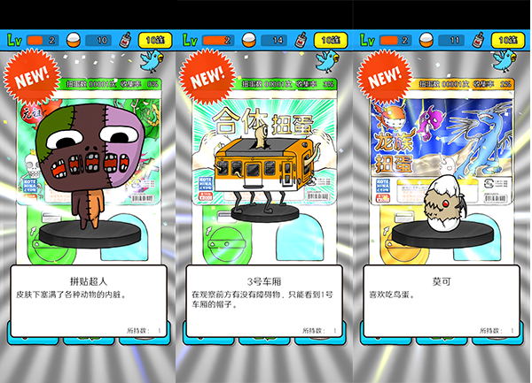 如图所示,《无限扭蛋》中各种扭蛋都是奇形怪状,绝对称不上美观。但就是这样奇葩魔性的外观在配上文字说明之后,却可以意外勾起玩家的好奇心,而且因为扭蛋机是没有图鉴的,每只新的扭蛋只有开出来的时候才能了解样子,让人抱着究竟还有怎样魔性的扭蛋去不断的探索,并且随着扭蛋数量的增加,想要把所有扭蛋都集齐的心情也会越来越强烈。