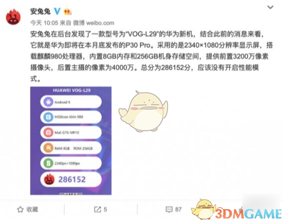采用的是2340×1080分辨率显示屏,搭载麒麟980处理器,内置8GB内存和256GB机身存储空间,提供前置3200万像素摄像头,后置主摄的像素为4000万。总分为286152分,应该没有开启性能模式。”