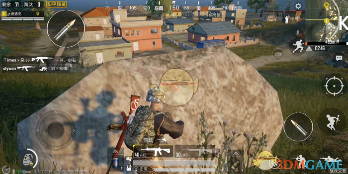 K城虽然是房区不过能在这里打巷战的机会不多,能落地解决的就落地解决了,除非是分布在上下两个城区才会有一个对拼的阶段。我们从上城区出来以后可以从山上绕到石头后面这个点位,在这里可以很好的观察到下城区里面的情况,因为我们地势高处于优势方,看到人找机会直接打掉就可以了。